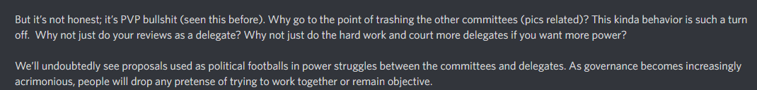 You seem to be the only person in these conversations not even trying to engage on the substance of the reviews and proposals. I haven’t seen you offer any feedback this round or actually detail what you like or don’t like the various proposals or recommendations. It’s like you are projecting this idea of a PVP power struggle because that is how you see the world while the rest of us are just trying (vigorously ofc) discuss the matters at hand.