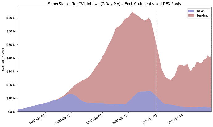 All things considered, SuperStacks attracted a meaningful amount of net TVL inflows, with lending markets in particular showing stronger retention than DEXs. At first glance, DEX liquidity retention appeared impressive, but closer inspection revealed that much of this performance was driven by Gauntlet’s co-incentivized pools. Lending pools fared better, but their striking TVL retention might have been bolstered by unknown external factors that came into play after SuperStacks ended.